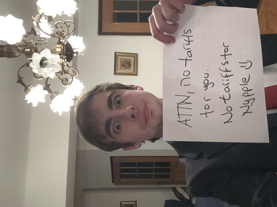 A young man holds a sign reading "ATTN, No tariffs for you