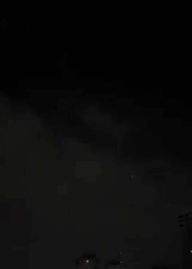 night scene with a dark sky, obscured by scattered clouds. In the lower portion of the frame, the silhouettes of several tall buildings are visible, suggesting an urban environment. Intermittent flashes of lightning illuminate the scene.
