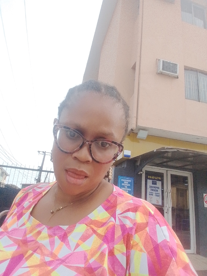 An outdoor, eye-level photograph captured in the city of Agani, Nigeria, depicts an adult female positioned prominently in the foreground, facing the camera