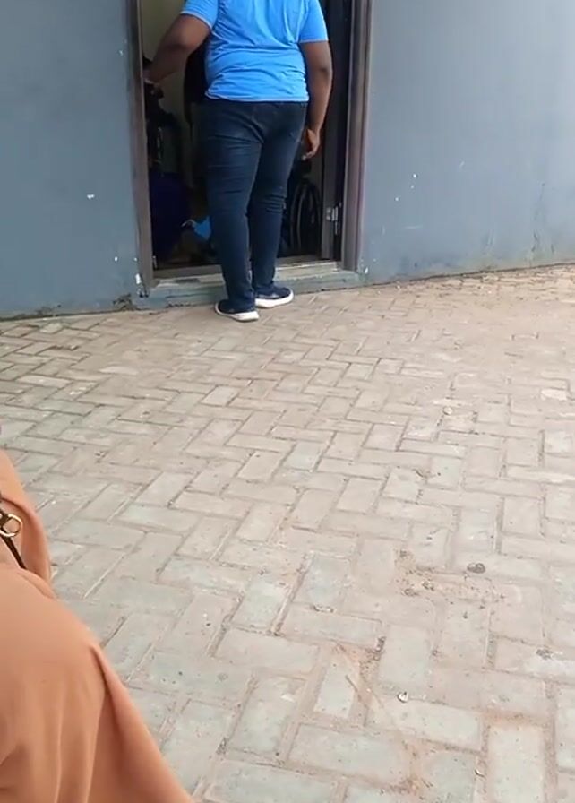 A person wearing a blue shirt and dark jeans enters a doorway and is visible from the waist down. The person may be helping someone in a wheelchair. The doorway is set into a gray wall with a brick-patterned sidewalk in front of it. Part of a person wearing brown clothing is visible in the lower left corner.