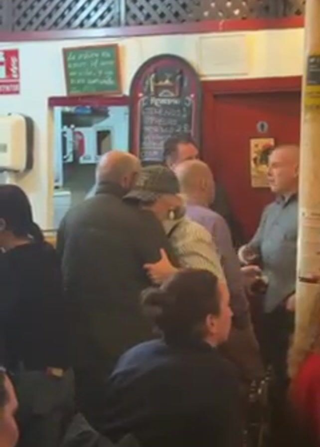 group of people in what appears to be a restaurant or bar. Several individuals are gathered near the entrance or doorway, engaging in conversation and what seems to be a cordial farewell. One person wearing a hat is being hugged by another. There are other patrons seated at tables around them. The restaurant has typical decor with a red door, lattice-like ceiling, and a sign indicating specials. A fire extinguisher is mounted on the wall.
