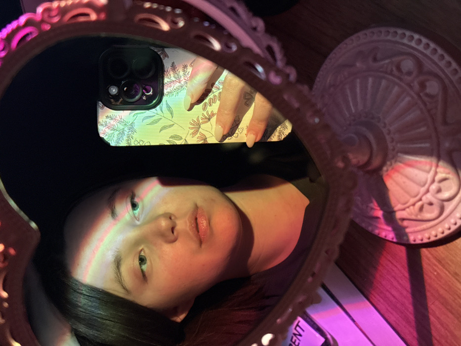 A mirror reflects a woman with a stripe of light across her face, black hair, and a black shirt. She is holding a phone with a floral case. Behind the phone, her hand with a small tattoo on the side can be seen. A white decorative object is also captured in the mirror's reflection, near the edge. The colors present are mainly pink, red, black and white, casting a dreamy and artistic light.