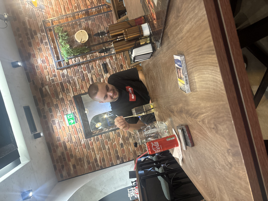 The scene depicts the interior of a commercial establishment, likely a restaurant or cafe, located in Lyaskovets, Bulgaria. One male individual, appearing to be in his 20s or 30s, is seated at a wooden table in the foreground. He has a short buzz cut and is wearing a black t-shirt with a white "smash" logo. The individual is observed stirring a clear beverage in a glass that contains a lemon slice, using a light-colored straw, and exhibits a slight smile. On the wooden table, from left to right, are: a red Coca-Cola can, a clear glass pitcher partially filled with water, a white paper napkin, a silver lighter positioned on a small red/black item, and a white cigarette pack. Further to the right on the table, a dark placemat is visible, supporting a condiment caddy containing at least two bronze-colored bottles and a napkin dispenser. The background features an exposed red brick wall. Above an archway in the brick wall, a green exit sign with a white arrow pointing down and left is mounted. Through the archway, another room or hallway is dimly visible, with a light source reflecting in a surface. To the right, another section of the brick wall is adorned with a black metal grid incorporating artificial green foliage and a circular wooden decorative piece. The ceiling is white with dark wooden beams and contains multiple recessed square light fixtures. Dark-colored chairs and tables are partially visible in the left and right background.