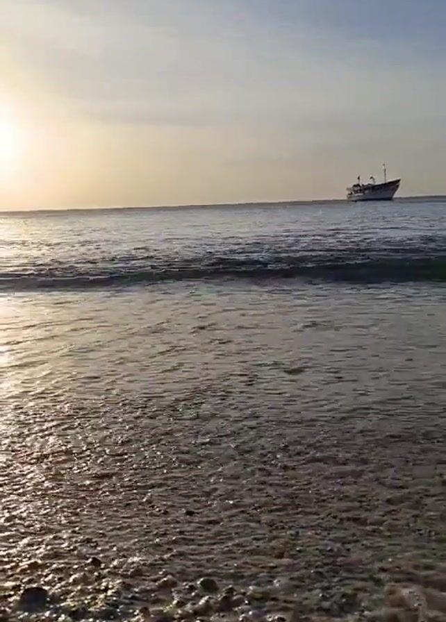 The scene is a beach with small waves gently rolling onto the shore. The beach is composed of small pebbles. In the background, a boat is visible on the water, silhouetted against the rising sun. The sky is mostly clear with a few wispy clouds. The light reflects off the wet sand and water, creating a sparkling effect.
