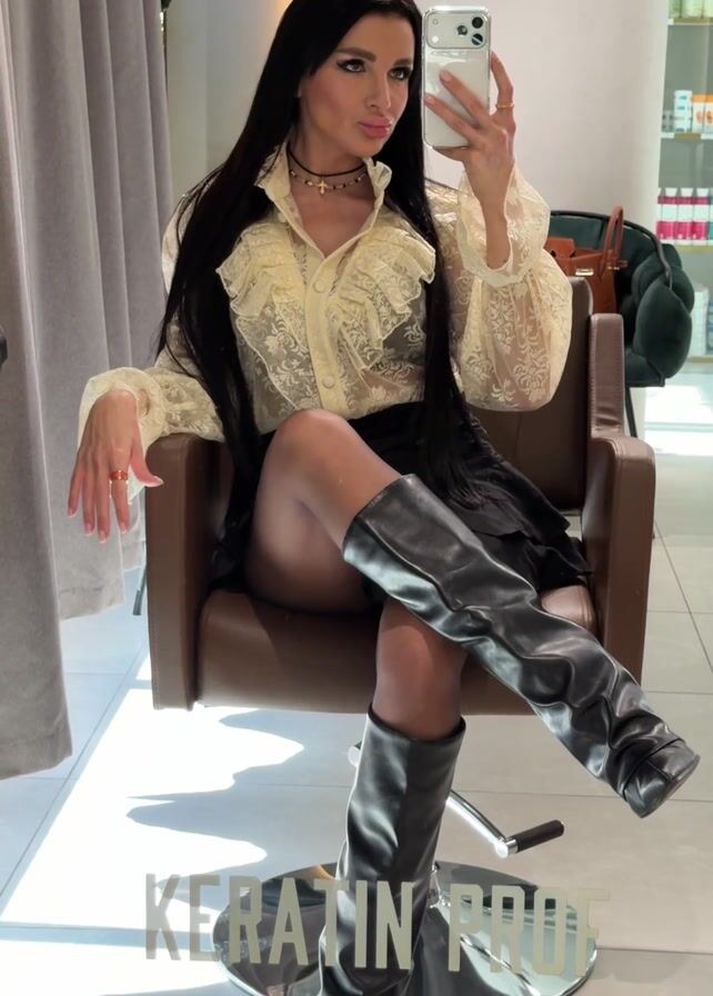 A woman with long black hair poses for a selfie in a salon. She is sitting in a brown leather salon chair. She is wearing a sheer, cream-colored blouse with ruffles, a black skirt, dark stockings, and tall black leather boots. She is holding a white smartphone in her right hand, taking a selfie. Her legs are crossed. In the background, a gray curtain partially covers a window with sunlight streaming through. A cabinet with hair products is visible in the upper right. The text "KERATIN PROOF" is digitally added at the bottom.