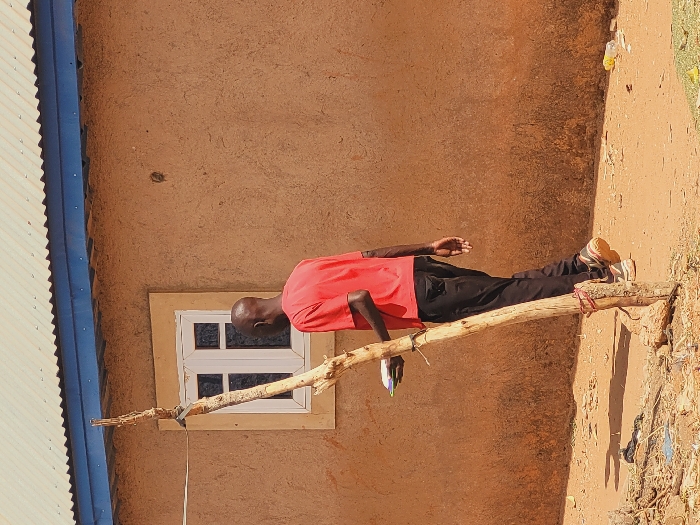 In Udu, Nigeria, an outdoor scene unfolds on a clear day. A bald, dark-skinned adult male, viewed from a rear-right perspective, walks left-to-right across a dry, unpaved dirt path. He wears a red short-sleeved t-shirt, black trousers, and athletic shoes with tan and white soles. His left hand holds a white rectangular dish containing light-colored items, possibly food, with hints of blue or purple. In the foreground, a slender, light-colored wooden pole, stripped of most bark and small branches, stands vertically. Red and white cords are tied around its lower section. A thin, taut line extends horizontally from near the pole's top toward the left, out of frame, appearing to connect to the adjacent building wall. Behind the man and pole is a building with a textured, light brown wall, consistent with a mud or stucco finish. A white-framed, multi-pane window is visible in the wall. Above the wall, a corrugated metal roof, light in color, is visible, featuring a distinct blue fascia board directly beneath its edge. The ground beneath the man and pole is sandy dirt, with scattered small debris including plastic and organic matter. Strong daylight casts defined shadows.
