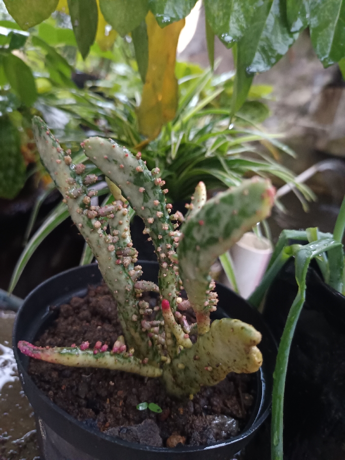 - "A variegated succulent plant, possibly a type of *Opuntia*, is centered in a black plastic pot, located outdoors in Limbangan Sari, Indonesia" by FM-WRTkH2, licensed under CC BY 4.0