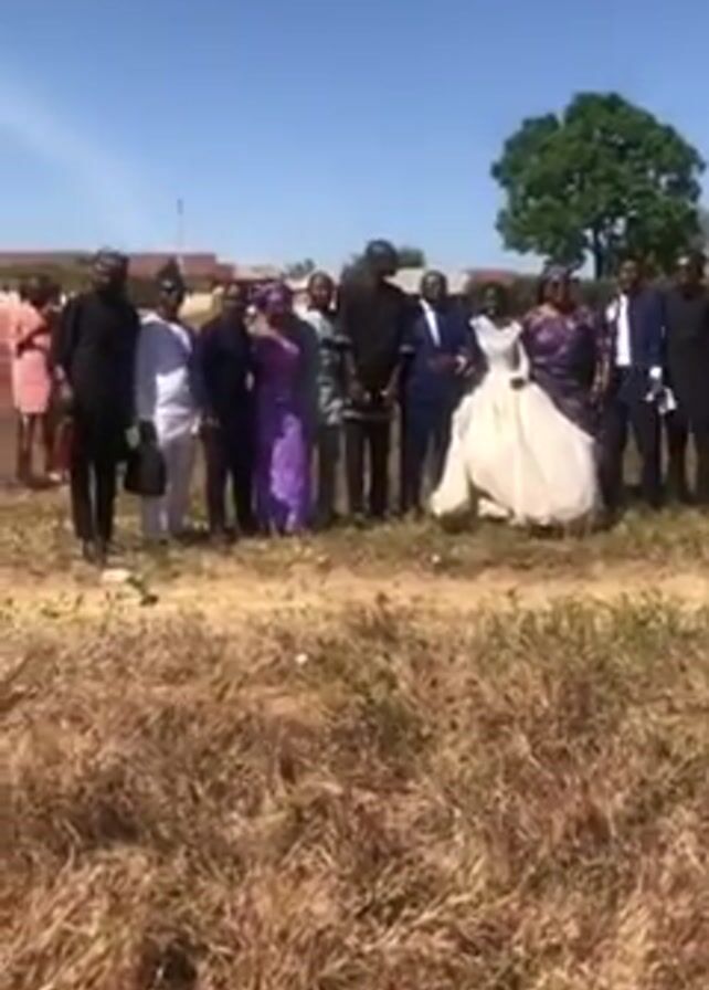 A wide shot shows a group of approximately fifteen people standing on dry, grassy ground in front of what appears to be a wedding party