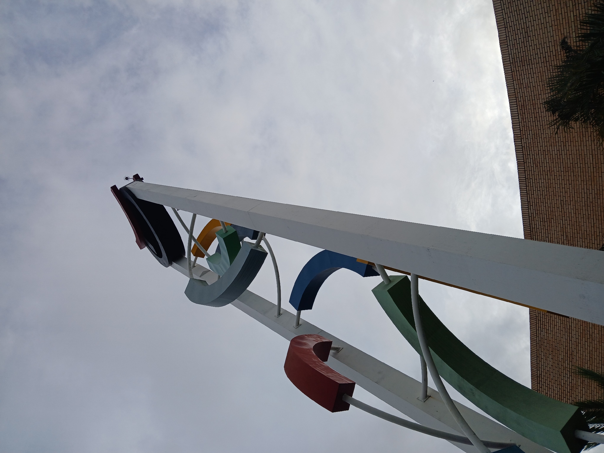 The image presents a low-angle view of a prominent, multi-colored abstract sculpture, identified as the Monumento a la Identidad Guayanesa (also known as Puerta del Orinoco), situated at the La Piña roundabout in Guayana City, Venezuela. The sculpture is composed of two tall, white vertical structural beams from which various curved and angular elements are suspended. These elements are rendered in distinct colors including red, dark blue, light blue, teal, yellow, and black, and are interconnected by thinner white horizontal and diagonal rods. A small light fixture or sensor is affixed to the uppermost point of the right white vertical beam. The background consists of an overcast, light grey sky with diffuse cloud cover. In the lower right quadrant, a building with a curved façade constructed of reddish-brown bricks is partially visible, its lower portion obscured by dark green, palm-like foliage. No individuals, specific actions, or interactions are depicted within the scene.