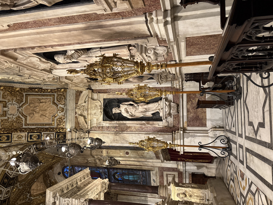 The image displays the interior of the Chapel of St. John the Baptist within the Cattedrale di San Lorenzo, located in Genoa, Italy. The scene is characterized by opulent Renaissance and Baroque architectural elements. The floor is an intricate mosaic of polished white, black, and reddish-brown marble tiles arranged in geometric patterns. Two tall, gilded processional lanterns with ornate Gothic tracery and internal illumination stand on black scrolled iron bases in the foreground. To the right, dark wooden pews or choir stalls with carved, gothic-style railings are partially visible. The walls are faced with panels of reddish-brown and white veined marble, surmounted by white marble pilasters and architectural moldings. In the mid-ground, a central niche prominently features a full-length white marble statue of a bearded male figure, identified as St. John the Baptist by Andrea Sansovino, clad in draped garments. To the right, a second, larger white marble statue of a robed figure, possibly an ecclesiastic wearing a miter, is situated within an adjacent niche. On the left, a multi-colored stained-glass window, predominantly blue and green, is partially visible behind a marble column. The high ceiling is extensively decorated with gilded coffering, intricate stucco, and high-relief carvings depicting figures such as cherubs. Multiple dark metal hanging lamps, appearing as censers with internal light sources, are suspended from the ceiling. The environment is illuminated by artificial light sources and ambient light filtering through the stained glass. No people are present in the depicted scene.
