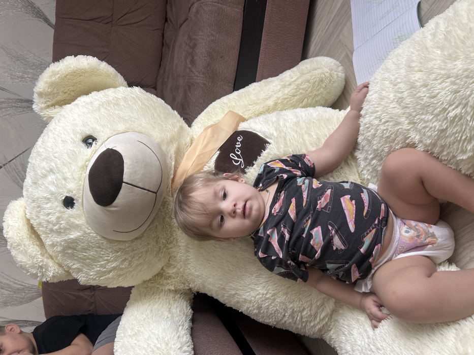 The scene depicts an indoor residential environment, likely in Chaikovsky, Russia. A large, cream-colored plush teddy bear is positioned centrally, taking up the majority of the background and mid-ground. An infant, with fair skin and light hair, sits on the lower body of the teddy bear, facing slightly to the left of the camera with an open-mouthed expression. The infant wears a dark t-shirt with a multicolor sneaker pattern and a printed disposable diaper. The teddy bear features dark brown accents on its nose and paw pads, and black eyes. A light brown ribbon is tied around its neck, displaying a dark brown heart-shaped tag inscribed with the word "Love" in white text. To the far left in the background, a second individual, appearing to be an older child or adolescent, is partially visible, seated on a brown upholstered sofa. This person wears a black t-shirt and grey shorts. The sofa is visible in the background, along with a light-colored wall featuring a subtle patterned wallpaper. The floor is a light-toned laminate or wood-effect material. An open notebook with ruled lines and some faint markings lies on the floor to the right of the infant and the bear's leg.
