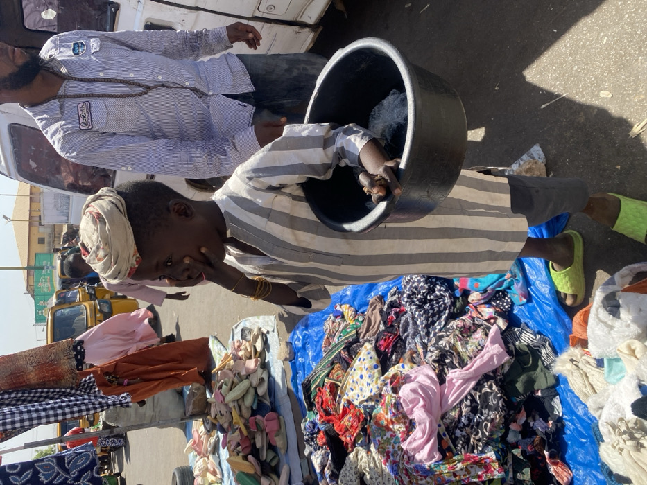 The image depicts an outdoor market scene in Sabon Gari South, Nigeria, under bright daylight