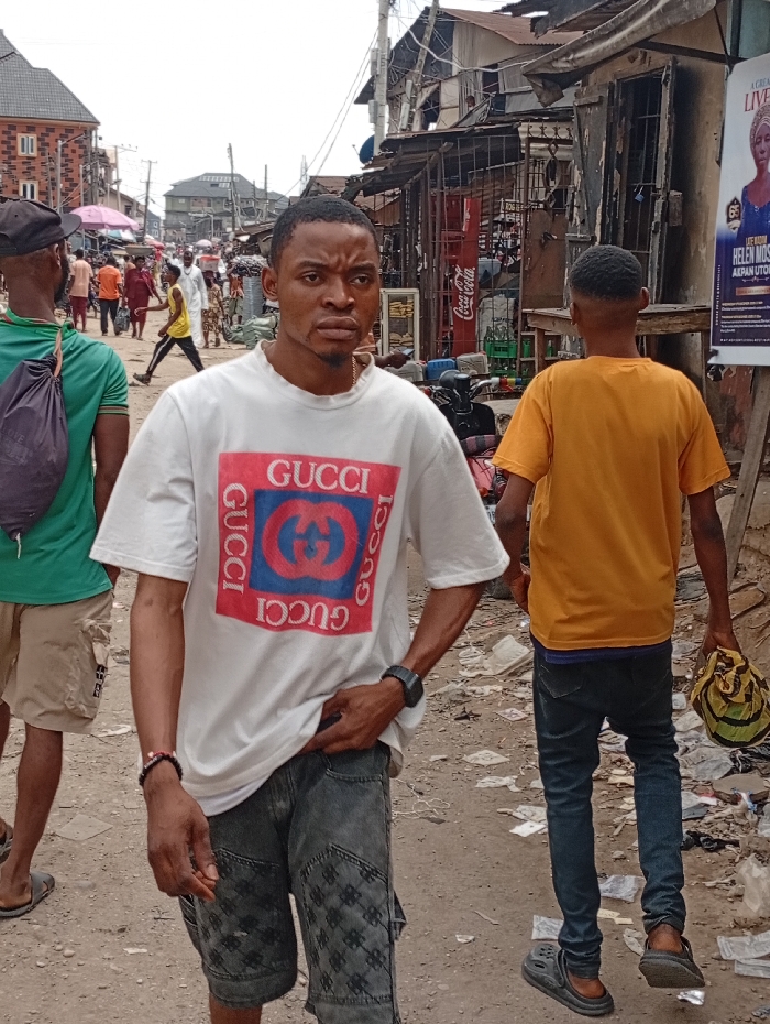A man in a Gucci t-shirt and patterned jean shorts stands in a crowded outdoor market or street