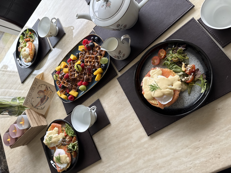 The scene depicts a meticulously arranged breakfast or brunch spread on a light-colored, possibly marble or granite, tabletop within an indoor setting in Wychavon, United Kingdom. Three individual place settings are visible. In the upper-left, a rectangular wooden box holds three lit candles in glass holders: one pink, one white, and one amber. Behind it, a clear glass vase contains green foliage. Next to the candles, an open "Happy Mother's Day" card, featuring a decorative illustration of a bird on a swing, rests on the table. Towards the upper-middle left, a black plate on a dark brown rectangular placemat presents a portion of Eggs Benedict, consisting of a toasted English muffin topped with smoked salmon, a poached egg, and hollandaise sauce, garnished with fresh dill. A small side salad with mixed greens and cherry tomatoes accompanies it. Directly below this, an empty white teacup with a subtle floral pattern and gold rim sits on a dark brown square coaster. In the mid-right, a large blue oblong platter, positioned on a dark brown rectangular placemat, is filled with multiple waffles drizzled with chocolate sauce. These are generously topped with various fresh fruits, including diced mango, red raspberries, blueberries, and sliced green grapes. In the lower-right quadrant, a white porcelain teapot with a floral design and silver trim rests on a dark brown rectangular placemat. Adjacent to it, a small matching porcelain creamer or milk jug, also with a floral pattern and silver trim, sits on another dark brown rectangular placemat. Partially visible in the bottom-right corner is the rim of an empty white teacup on a dark brown square coaster. Towards the upper-right, a third place setting, largely obscured, shows a black plate on a dark brown rectangular placemat holding a similar Eggs Benedict dish. An empty white teacup on a dark brown square coaster is positioned to its left. No individuals are present in the image.