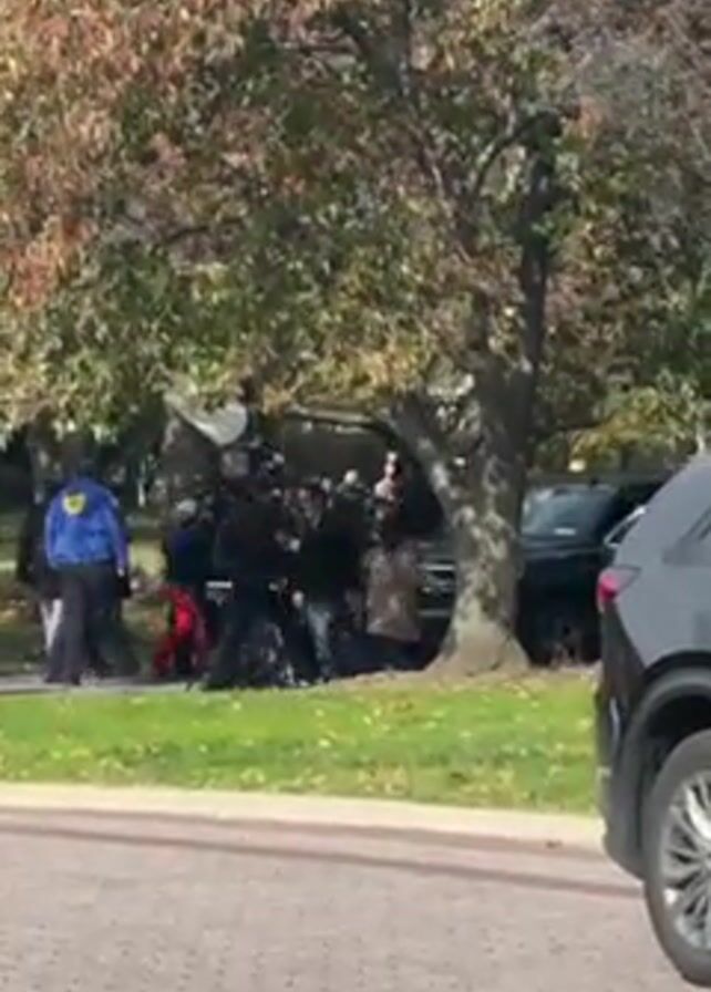 group of people gathered near several black SUVs under a large tree with foliage in varying shades of green, yellow, and brown. The people are dressed in diverse clothing, including a blue jacket with yellow lettering and a tan coat with jeans. A black car is parked on the side of the road in the foreground. Some individuals appear to be taking pictures or filming with their phones. The scene suggests an event or gathering taking place in an outdoor setting, possibly a park or residential area, on a day with good weather.