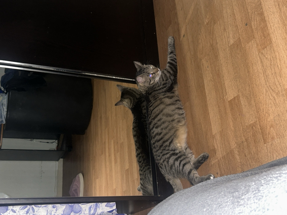 A tabby cat stretches up against a dark-framed mirror, its right paw reaching upwards. The cat's reflection is visible in the mirror. The cat is standing on a grey surface, likely a bed or sofa, and the floor is a light brown wood. A wardrobe with sliding doors and a glimpse of items inside can be seen in the mirror.