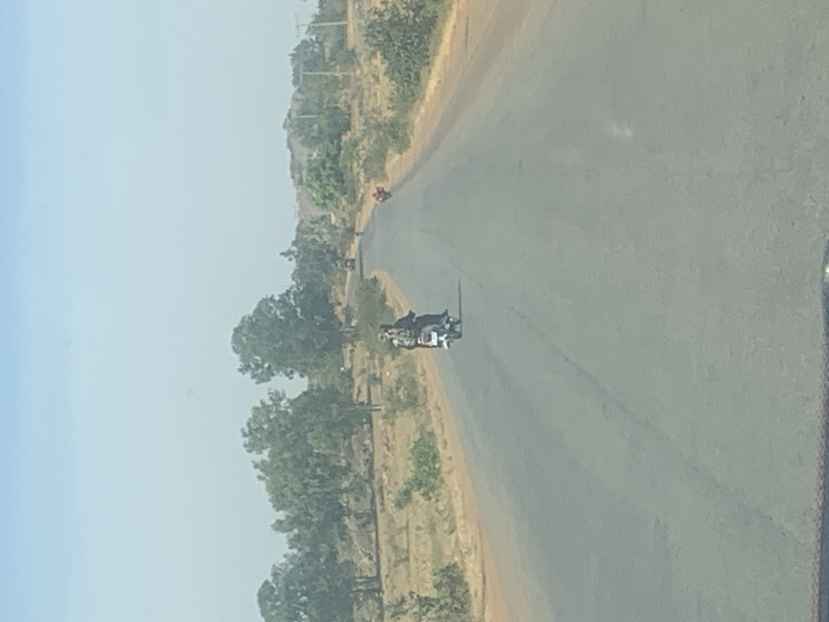 A road extends into the distance, flanked by trees and arid vegetation. A motorcycle, appearing to carry a load, travels along the road towards the foreground. Another motorcycle is visible farther up the road. The sky is a hazy blue.