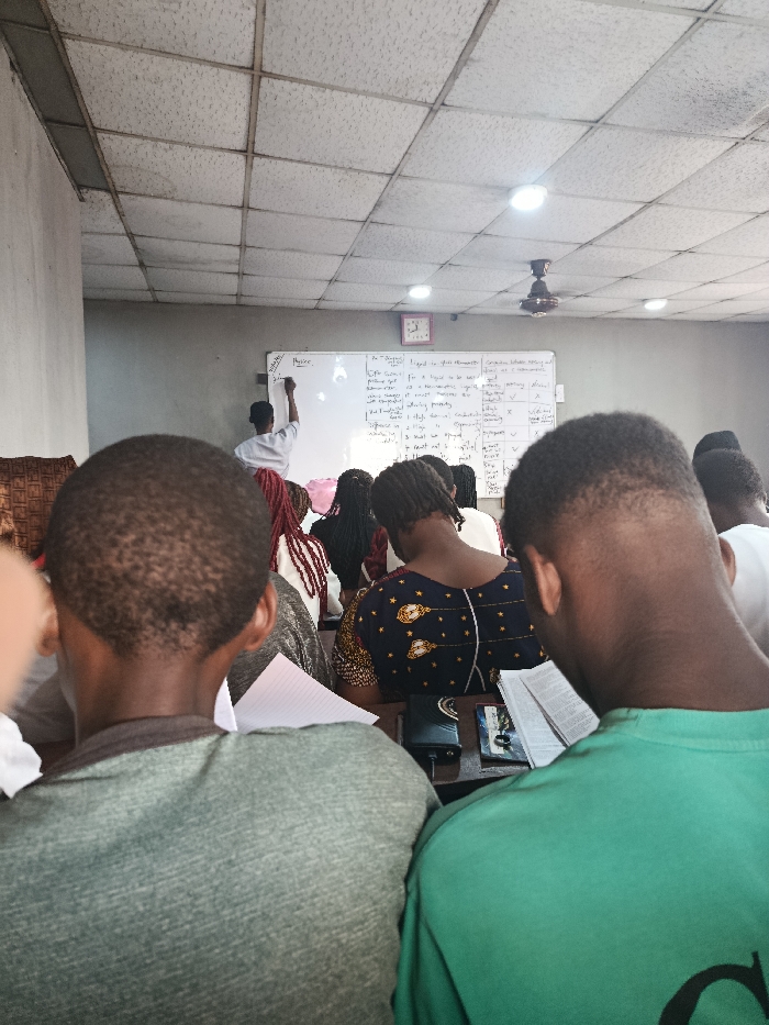 The image depicts an indoor classroom scene in Warri, Nigeria