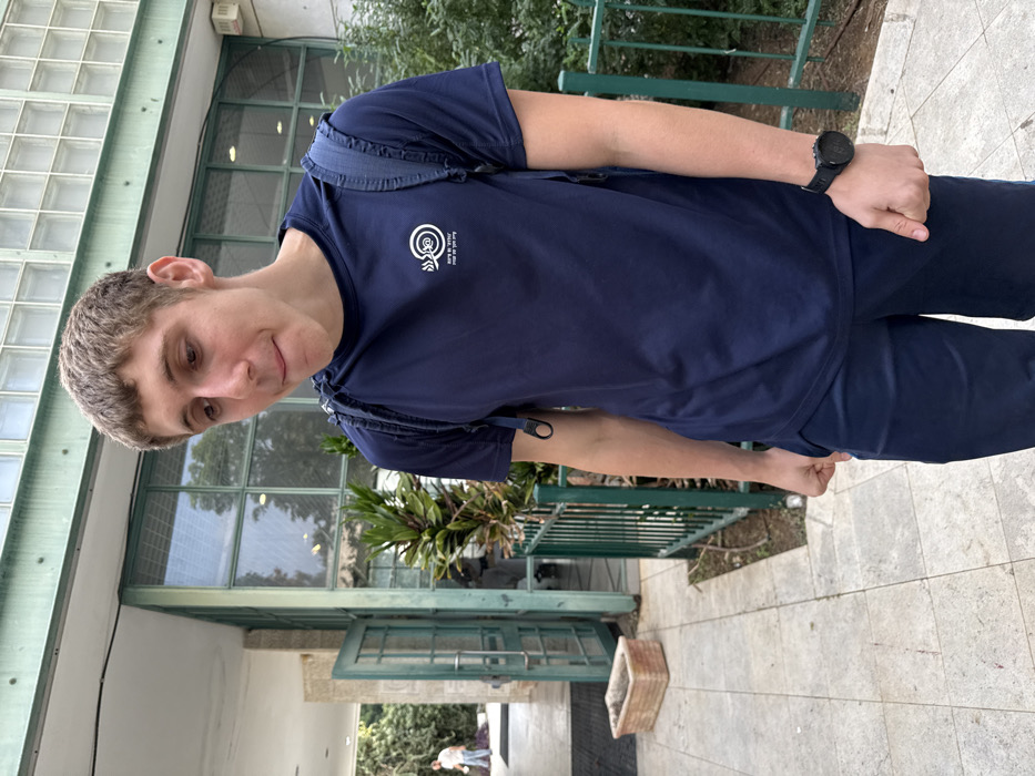 A young male, appearing to be a teenager or young adult, stands on a light-colored tiled pathway in front of a building entrance at an ORT Learning Center in Ness Ziona, Israel