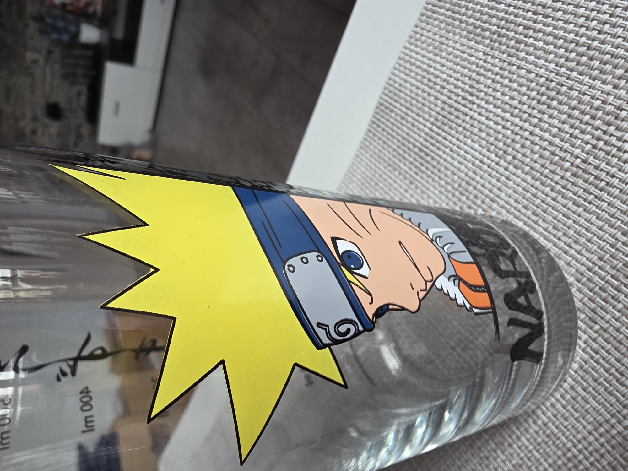 A close-up shot depicts a glass featuring a graphic of the character Naruto