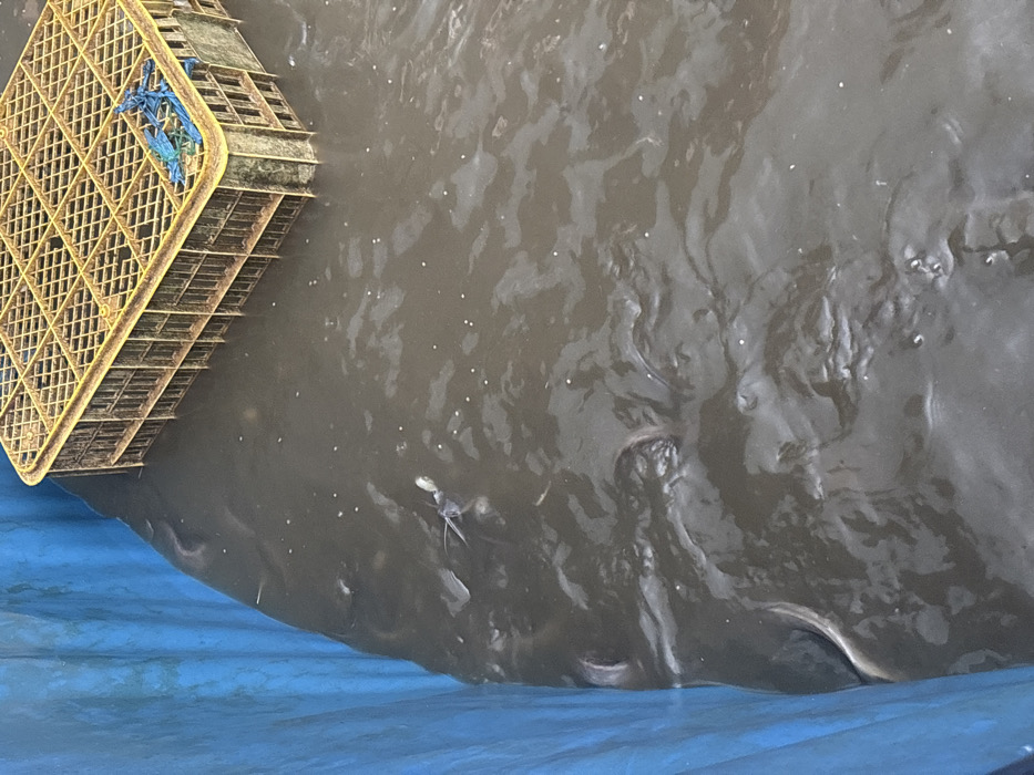 The image displays an aquaculture tank located in Tambakrejo, Indonesia. The tank's left side is lined with a blue tarp. The water within the tank is dark brown and murky, with visible surface ripples and scattered white specks. Numerous live catfish are densely populating the water, actively swimming and congregating. A yellow, square-gridded plastic crate is partially submerged in the upper right quadrant of the tank, with small fragments of blue plastic debris resting on its top surface. No human figures are present in the frame.