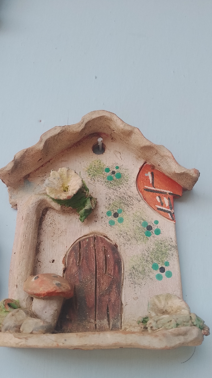 A decorative relief sculpture of a stylized house, crafted from unglazed, light beige material resembling clay or terracotta, is mounted against a plain light blue wall. The house features an undulating, reddish-brown roof. An arched, dark brown door with vertical striations mimicking wood planks is positioned centrally on the lower facade. On the upper right, a small, triangular orange window with dark horizontal and vertical lines is visible. The house wall is painted with irregular green patches and scattered dark teal circular dots. A light yellow flower with a green base protrudes from the upper left side of the house. A reddish-brown mushroom with a light-colored stem is located on the lower left, adjacent to the door. The base of the sculpture incorporates irregular, textured forms suggestive of rocks and foliage. A circular hole, containing a white wall plug, is visible at the top center of the house, indicating its suspension mechanism. The location is an interior space, specifically a wall, within the city of Unknown, Unknown. No individuals are present in the scene, and no actions or interactions are depicted.