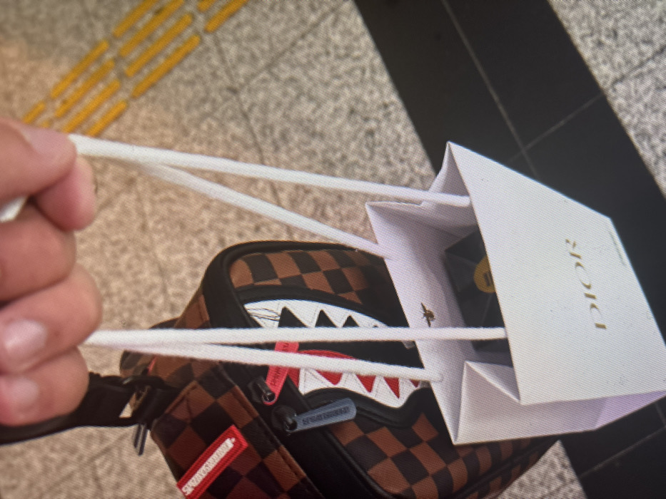 A hand grasps the white string handles of a small, white paper shopping bag displaying "DIOR" in gold text on its front. Inside the bag, a dark object with a yellow element is partially visible, alongside a small gold bee emblem affixed to the interior. To the left, a portion of a brown and dark brown checkerboard-patterned bag, featuring a white shark-mouth design with red and black accents and a blue zipper pull, is present. The background shows a light grey tiled or paved surface with dark grey grout lines. In the upper right, yellow tactile paving strips are visible. A dark shadow extends across the lower right ground area. This scene is located in Lovech, Bulgaria.
