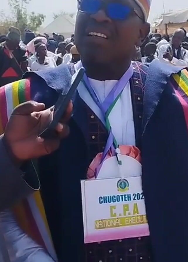 Here is a detailed description of the video: **Setting:** The video appears to be taken outdoors at a crowded public event. The ground is dusty, and there are people in the background. White tents are visible in the background, providing shade for some attendees. Trees are sporadically distributed across the landscape. The event seems to be taking place during the daytime under a bright sky. **People:** Two men are prominently featured. One man, who seems to be the subject of an interview, is wearing sunglasses, a traditional hat with colorful stripes, a navy blue garment with colorful accents, and an event badge that reads "CHUGOTEN 2023 C.P.A. NATIONAL EXECUT." The other man, who appears to be the interviewer, is dressed in a light gray traditional garment and is holding a cell phone, presumably to record the conversation. The background is populated with numerous people, some in traditional attire, children in various outfits, and individuals sitting or standing. **Actions and Interactions:** The interviewer holds a cell phone to record the other man, who is speaking and gesturing with his hands, suggesting an interview or a speech. The crowd behind them is milling around, implying a lively and social atmosphere. **Objects:** Key objects include the cell phone held by the interviewer, the badge worn by the interviewee, the white tents in the background, and the traditional attire worn by many individuals.