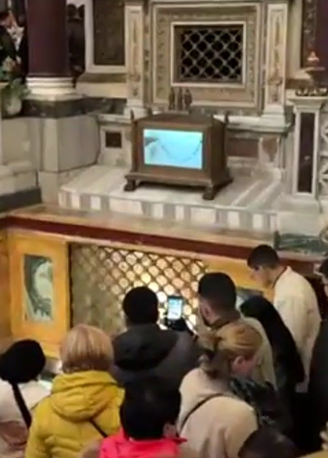 crowd of people inside a large, ornate building, possibly a church or cathedral. They are gathered in front of a raised, enclosed space with a small, old-fashioned TV screen displaying what appears to be a chain. Several people are taking photos or videos of the display with their phones. The surrounding architecture includes marble columns, decorative stonework, and potted plants. A lit candle sits in a metal holder in the foreground. The people are wearing various colors of clothing, including yellow, red, and black.