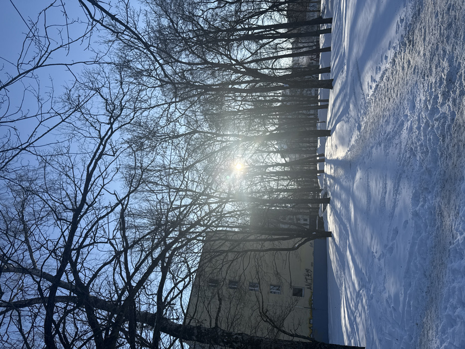 The image depicts a winter scene captured during daylight hours in a residential park or greenspace within the city of Riga, Latvia. The ground is uniformly covered in a layer of white snow. A partially cleared or well-trodden path, approximately 1.5 meters wide, extends diagonally from the lower right foreground towards the mid-ground left, revealing disturbed snow and some darker ground beneath. Numerous footprints are visible along and adjacent to this path. The mid-ground is dominated by a dense arrangement of numerous deciduous trees, all bare of leaves, indicating winter. The sun, positioned towards the center-right of the frame, casts long, distinct shadows from these trees across the snow-covered ground, extending towards the foreground. A strong sunburst effect is visible through the tree canopy. The sky above is clear and bright blue. In the background, on the left side of the frame and partially obscured by trees, stands a multi-story, light-colored (possibly yellow or off-white) apartment building. The lower portion of this building features graffiti in yellow and black spray paint, including legible letters "AVTE" and a heart symbol. Further into the background, subtle outlines of additional structures and what appears to be a small playground apparatus (possibly a swing set) are discernible through the trees. No individuals are visible in the scene.