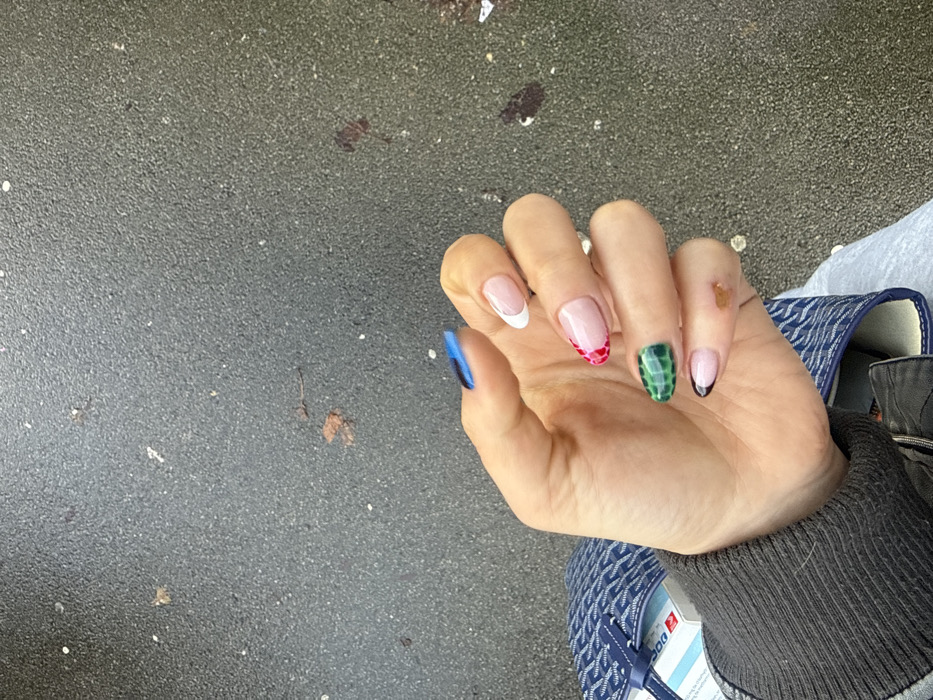 A person's left hand and forearm are positioned in the lower-left quadrant of the frame, foregrounded against a dark grey, textured ground, identified as occurring in Wattrelos, France. The hand exhibits five manicured nails: the visible portion of the thumb nail has a blue tip; the index finger nail features a white French tip; the middle finger nail displays a red and pink pattern with a white French tip; the ring finger nail is green with a scale-like pattern; and the pinky finger nail has a black French tip. A small, irregular yellowish-brown mark is present on the skin of the pinky finger, near the nail. The subject's left forearm is clad in a dark grey, ribbed long-sleeved garment. A light grey garment is visible on the lap, suggesting a seated position. To the immediate left of the hand, a blue and white patterned bag, possibly a tote, is partially visible, with a white rectangular box resting upon it. The background ground surface, consistent with asphalt or pavement, is scattered with small white specks, several dried brown leaves, and irregular dark stains.