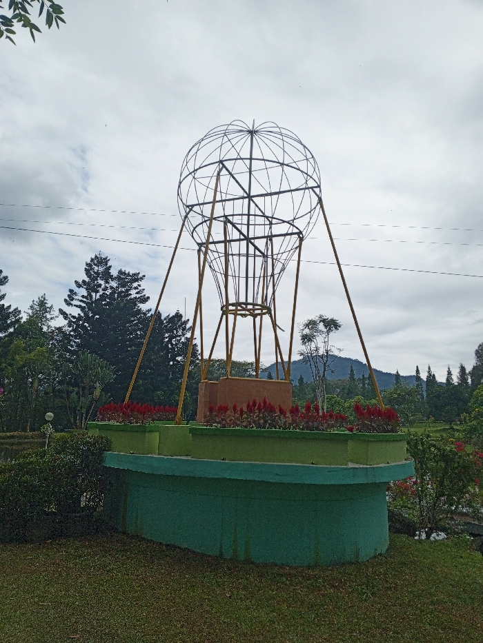 A sculpture of a hot air balloon made of metal wire stands on a green platform with red flowers. The sky is cloudy. Trees and a mountain are in the background. There is a brown structure at the center of the platform, from which the balloon's wire frame ascends. Three metal supports angle from the top of the sphere to the platform's corners. A power line stretches across the top of the image.