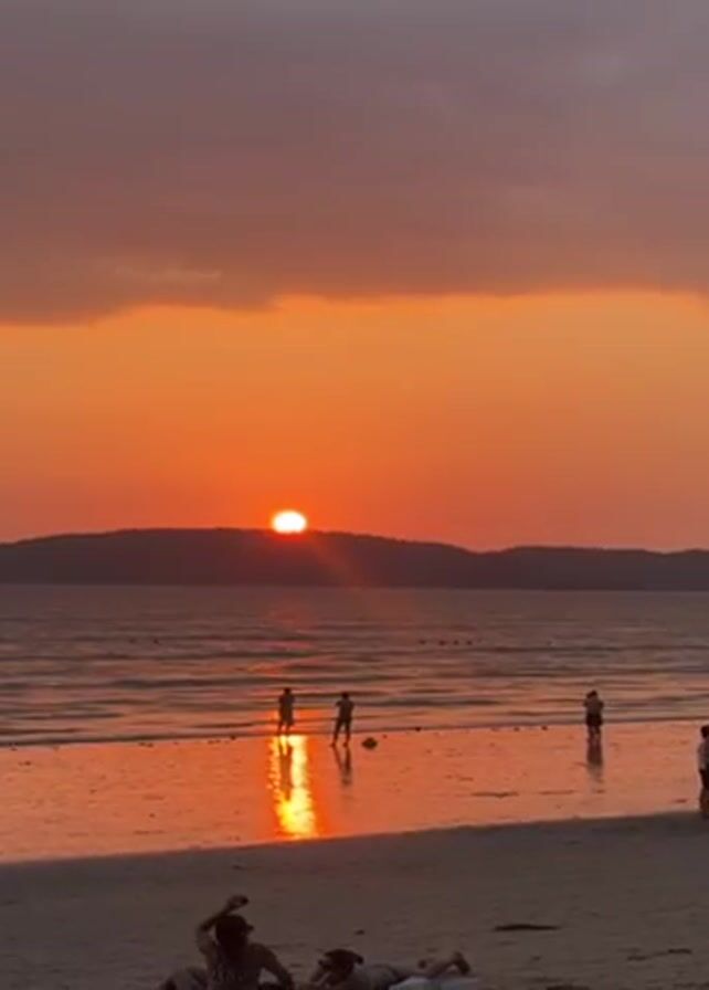 The video depicts a sunset over a beach, with the sun appearing as a bright orange orb setting behind a dark, hilly horizon. The sky is filled with clouds tinged with orange and pink hues. The beach is sandy, and the wet sand reflects the sunlight, creating a shimmering effect. Several people are visible on the beach: some are standing near the water's edge, some are in the water, and some are lying down on the sand. The sea is calm with small waves.