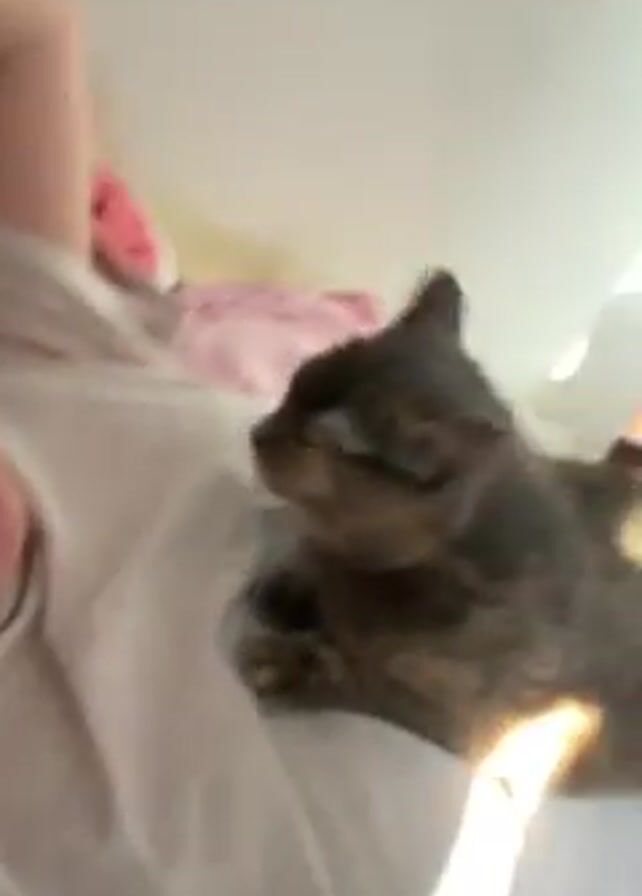 A woman lies on a bed, looking at the camera. She has fair skin, brown hair, and is wearing a light-colored t-shirt. A gray-brown tortoiseshell cat is resting on her chest. The bed has light-colored sheets and pillows, including a pink pillow and a round watermelon-shaped pillow. Sunlight streams through a window, casting bright spots on the ceiling and bed. The woman gently strokes the cat's head with her hand. She is wearing an Apple Watch on her left wrist. The cat sits still, looking towards the window.
