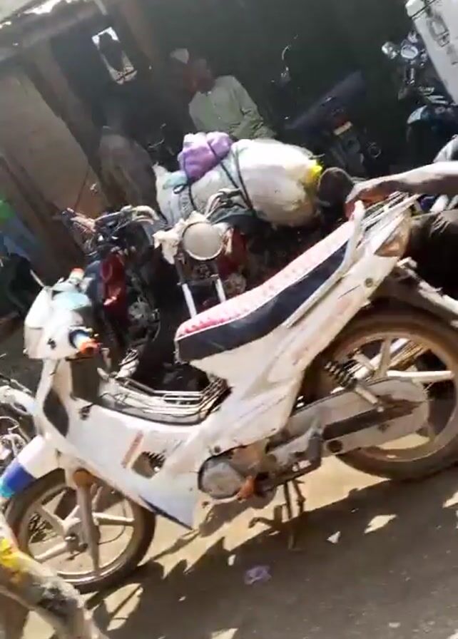 busy street scene, possibly in an urban area of West Africa. Several motorcycles are parked or being worked on near a simple, open-sided shop structure with a corrugated metal roof. People are seen walking around. One man is kneeling next to a motorcycle, apparently performing repairs. Other people are standing and watching. The ground appears to be a mix of dirt and pavement. The buildings in the background appear to be constructed with basic materials, and one larger building has scaffolding on its side. The overall impression is one of a bustling, informal economy.