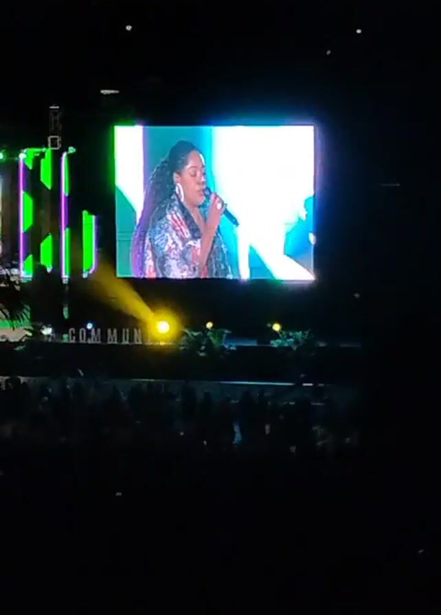 large screen on a stage, displaying a woman with dark hair singing into a microphone