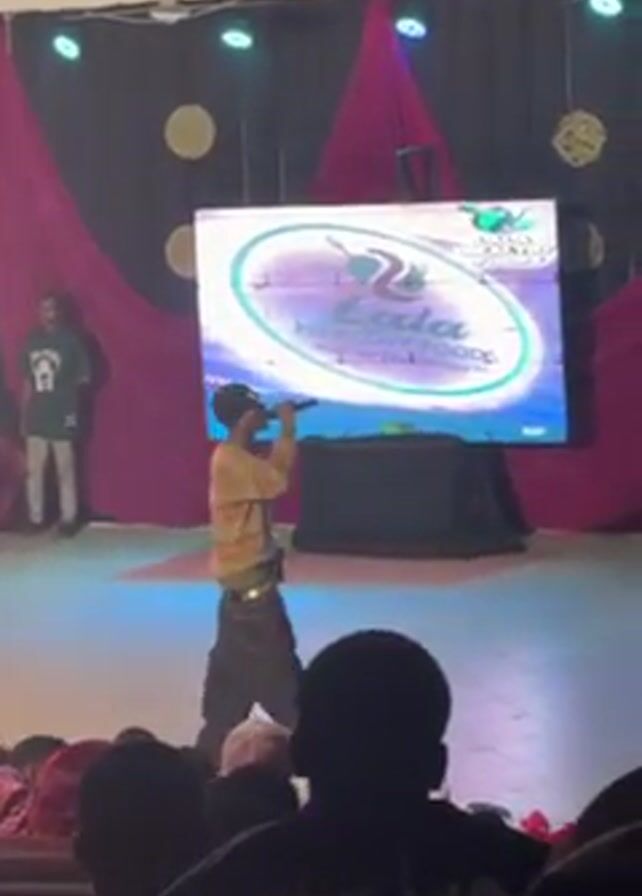A young man is performing on a stage in front of a crowd. The stage is decorated with magenta draping and illuminated by blue and green lights. Behind the performer is a large screen displaying a logo for "Lala Healthy Foods" and then a cartoon-like animated sequence. A man in a green and white shirt stands off to the left side of the stage. The performer is dressed in a striped shirt and baggy black pants, and he is singing into a microphone. The audience is visible in the foreground. A ceiling fan is visible on the ceiling.
