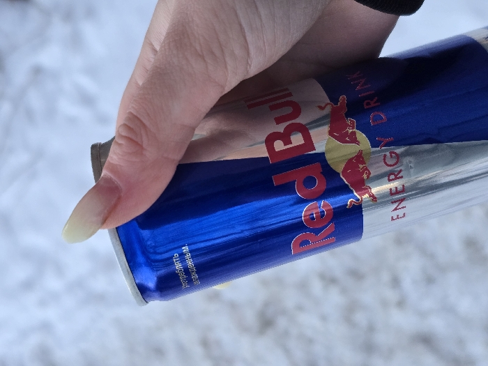 A hand holds a can of Red Bull energy drink. The can is primarily blue with silver accents and features the Red Bull logo. The hand has long, well-manicured nails. The background appears to be snow or a light-colored, textured surface. The can is angled slightly downward. The focus is sharp on the can and hand, with a blurred background.