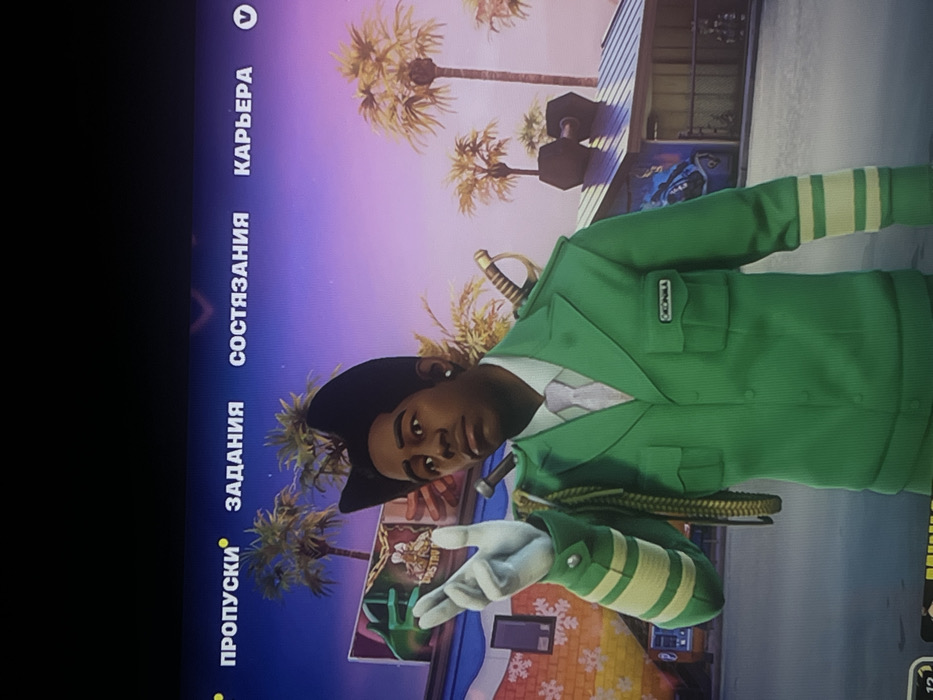 This image is a photograph of a digital display showing a video game interface. The top portion of the screen features game menu options in Russian, reading from left to right: "ПРОПУСКИ" (PASSES), "ЗАДАНИЯ" (TASKS), "СОСТЯЗАНИЯ" (COMPETITIONS), and "КАРЬЕРА" (CAREER), alongside a circular icon with a 'V'. The central figure is a dark-skinned male video game character with black hair styled into two prominent points resembling animal ears, and a silver stud earring in his left ear. He is dressed in a bright green military-style uniform, which includes a white collared shirt, a white tie, and white gloves on his hands. The uniform features gold stripes on the forearms of both sleeves and a small badge on the left chest pocket that reads "OKONALA." A coiled gold rope is draped over his left shoulder, and the gold hilt of a sword is visible behind his right shoulder. The character's right hand is raised, with fingers forming a gesture, and he exhibits a neutral expression. The background depicts a stylized, vibrant outdoor environment within the game, characterized by numerous palm trees against a gradient sky that transitions from purple to pink. Various buildings are visible, including one on the left with a partially obscured "MERRY CHRISTMAS" banner and white snowflake decals, another building with a "GASTRO" sign, and a structure on the right with graffiti art and two large black dumbbells resting on its corrugated roof. The overall scene suggests a fictional, warm-climate setting. While the game's interface is presented in Russian, consistent with being played on a system configured for the Russian language, which could be located in Lyubertsy, Russia, the visually depicted game environment itself is a fictional digital construct and does not represent a real-world location within the city of Lyubertsy.