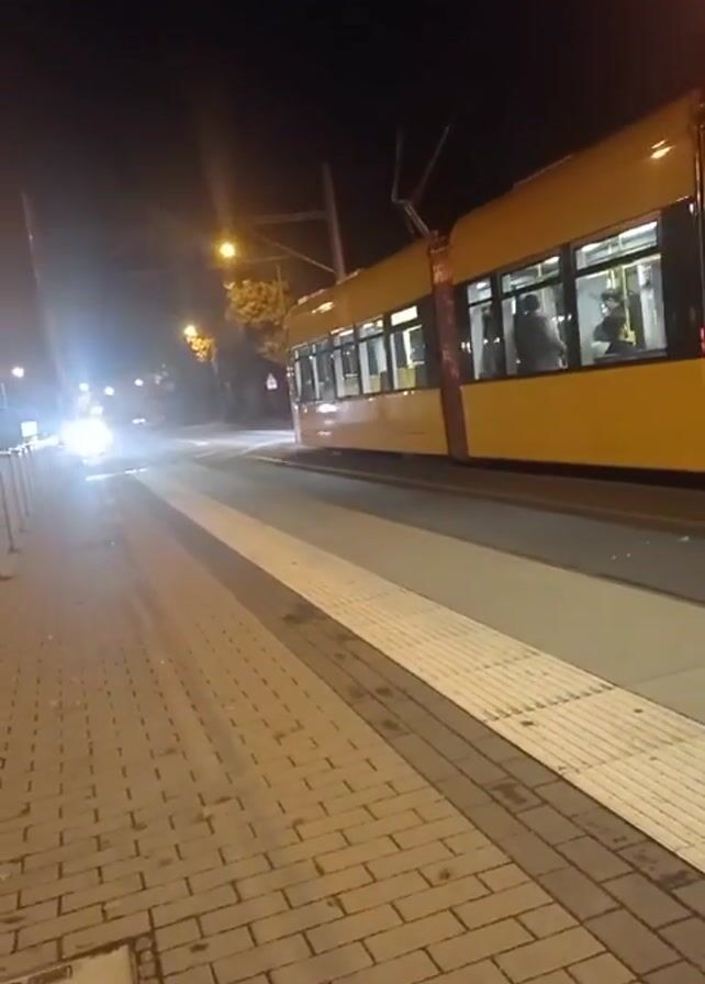 - "At night, a yellow and white tram passes from right to left on a city street" by FM-Y1fxo1, licensed under CC BY 4.0