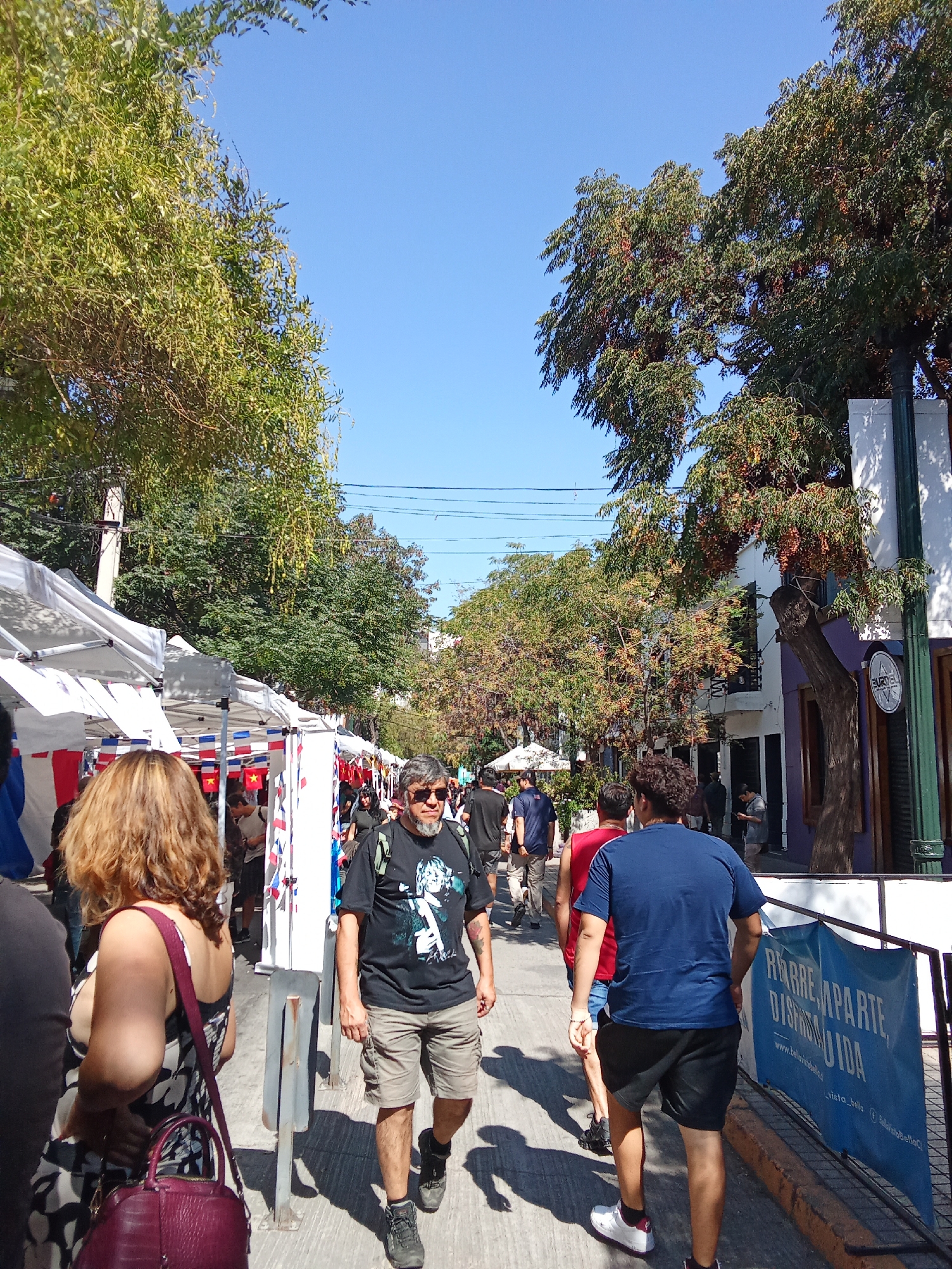This image captures a bustling street scene in what appears to be a market or fair, likely located in Providencia, Chile, given the Chilean flags prominently displayed. People are walking in both directions along a sunlit pedestrian street. The street is lined with white tents or stalls, some adorned with small Chilean flags. The presence of trees on both sides of the street casts shadows on the pavement. Several individuals are noticeable. A man with sunglasses and a black t-shirt depicting a rock image is walking towards the viewer. In the foreground, a woman in a black and white patterned dress is walking away from the viewer. In the background, a man in a blue t-shirt walks away from the viewer. Banners or signs are visible along the street. The street appears to be near buildings with distinctive architecture, including white and purple facades. Overhead wires and street lights are visible above. The sky is clear and blue.