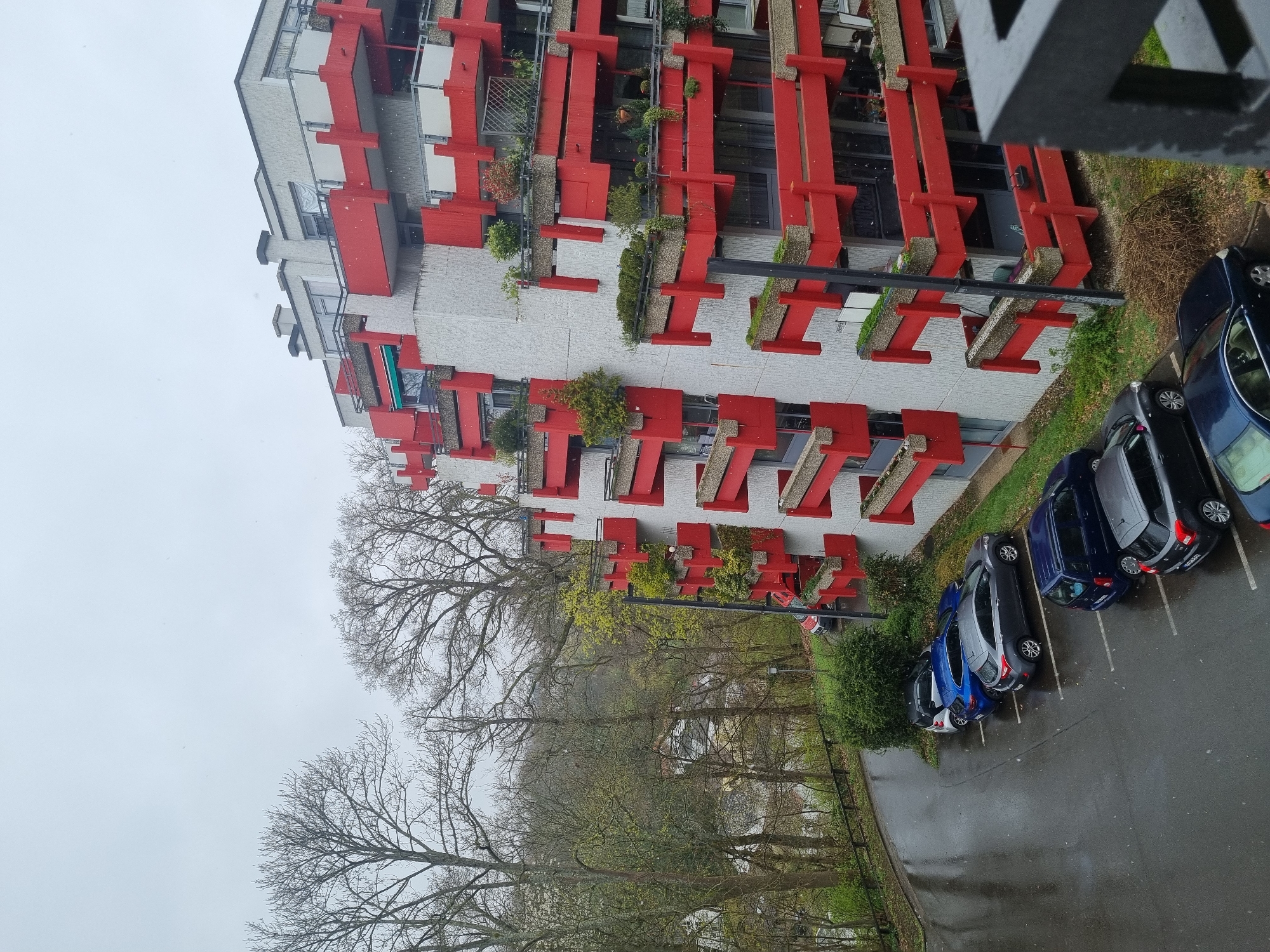 The image displays a high-angle, static outdoor scene in a residential area of Saarbrücken, Germany, under an overcast sky with visible light precipitation (small white specks indicative of snow or sleet). The central subject is a multi-story apartment building, constructed with light grey, textured concrete. The building features numerous prominent, red-painted, geometrically protruding balconies. Many of these balconies incorporate planters, some containing sparse green vegetation. A green awning is partially extended on an upper-level balcony, and a white fabric sheet is visible hanging from another balcony or window. Adjacent to the building, a wet asphalt parking lot contains six parked vehicles in marked spaces: a dark blue sedan (partially visible in the foreground), a dark grey hatchback, a dark blue minivan, another dark grey hatchback, a blue hatchback, and a silver/grey hatchback. A red vehicle is partially visible further down a sloped area near the building's base. The background consists of a dense treeline of predominantly bare deciduous trees, sloping downwards into a valley where faint outlines of distant structures are discernible. A black metal railing borders the parking lot, and patches of green shrubbery and grass are present around the building's foundation. No individuals are visible within the frame.