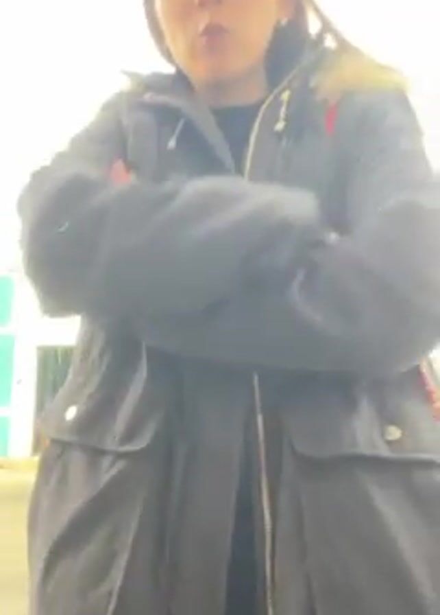 A woman wearing a dark-colored coat stands outside. She has her arms crossed. The camera rotates around her, showing she is wearing a small red handbag. The background includes a white building and a car. The sky is overcast.