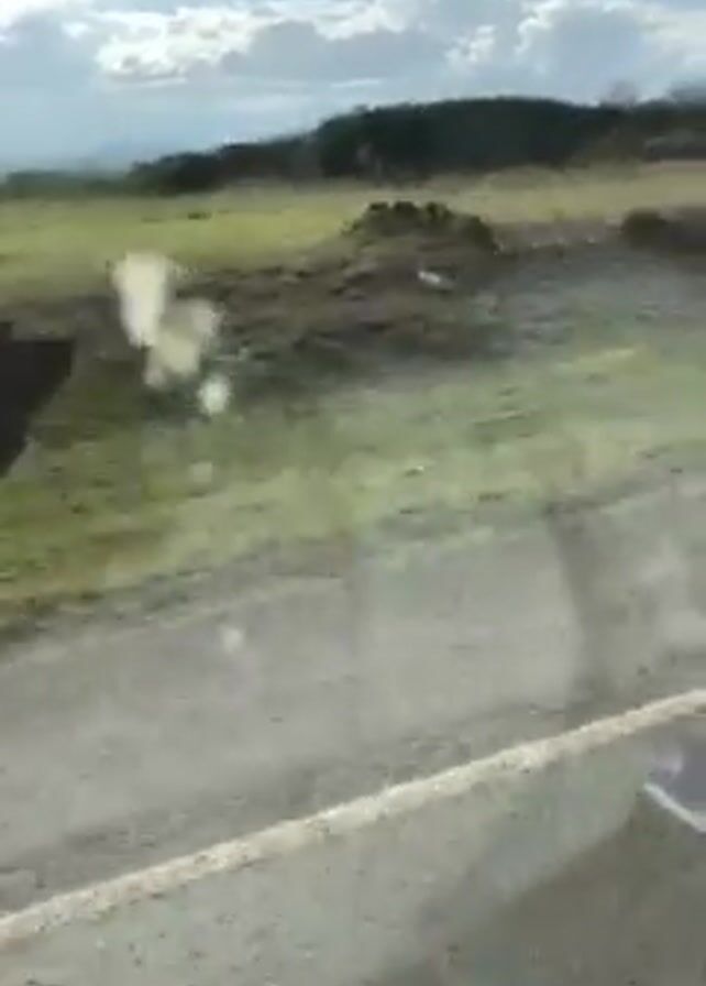 view from inside a moving vehicle. The camera is positioned to look out the side window at a rural landscape. A road is visible in the foreground. Adjacent to the road, there is a field with patches of green grass and bare earth. In the distance, there are some trees and a somewhat obscured horizon under a sky with scattered clouds. Another vehicle is seen passing by on the road. It appears to be a gray SUV, with damage to its rear end.