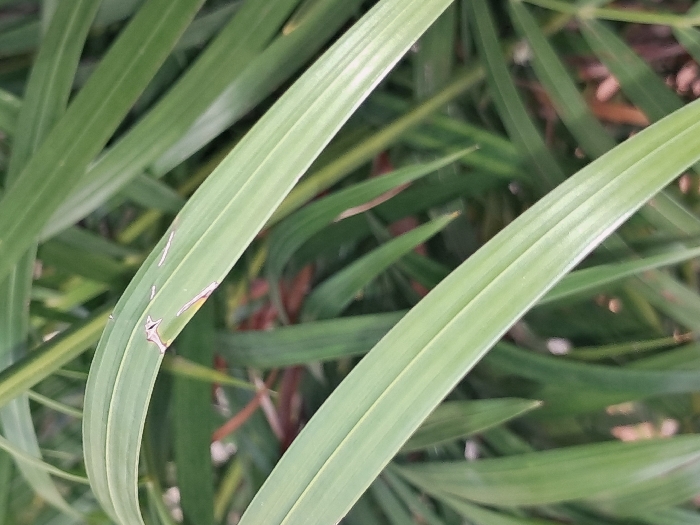 A close-up shot focuses on green, slender plant leaves, likely grass or a similar type of foliage. The leaves exhibit a smooth, linear texture with a prominent central vein. They intersect and overlap, creating a dense, natural pattern. One leaf has a minor tear or imperfection on its edge, revealing a lighter tone beneath. Background elements are blurred, emphasizing the foreground leaves and their subtle color variations.