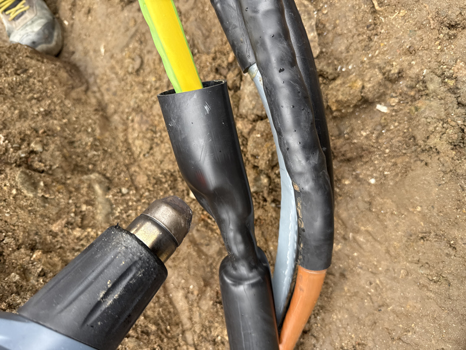 The scene is situated in Sozopol, Bulgaria, within an excavated area characterized by brown, granular soil with scattered small stones and debris. In the upper left, a dark grey and black heat gun with a metallic nozzle is aimed downward. It is actively applying heat to a black heat-shrinkable sleeve. The left portion of this sleeve is already fully contracted and conformed around an electrical cable, forming a smooth, tapered seal. The right end of the sleeve remains un-shrunk and cylindrical, exposing a brightly colored yellow and green internal cable conductor or insulation. Below this primary point of work, multiple other electrical cables are visible on the soil. These include a light grey cable and an orange cable, both partially covered by black insulation or heat-shrink material. In the upper right corner, a portion of a person's foot, wearing a grey and yellow work boot, is visible. The depicted action involves the sealing of an electrical cable connection or splice using a heat gun and heat-shrink technology.