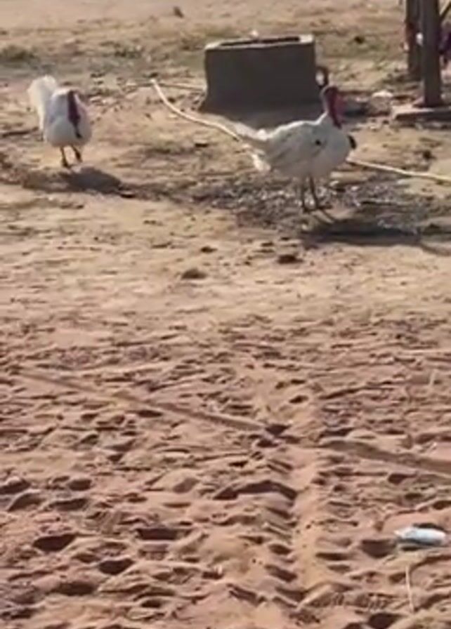 two white turkeys with red heads walking around a sandy, dry area. One turkey is predominantly white with some darker spots, while the other is almost entirely white. In the background, there is a concrete structure, a yellow hose, and a wooden pole with some cloth hanging on it. Tire tracks are visible in the sand in the foreground. The weather appears to be sunny and clear.
