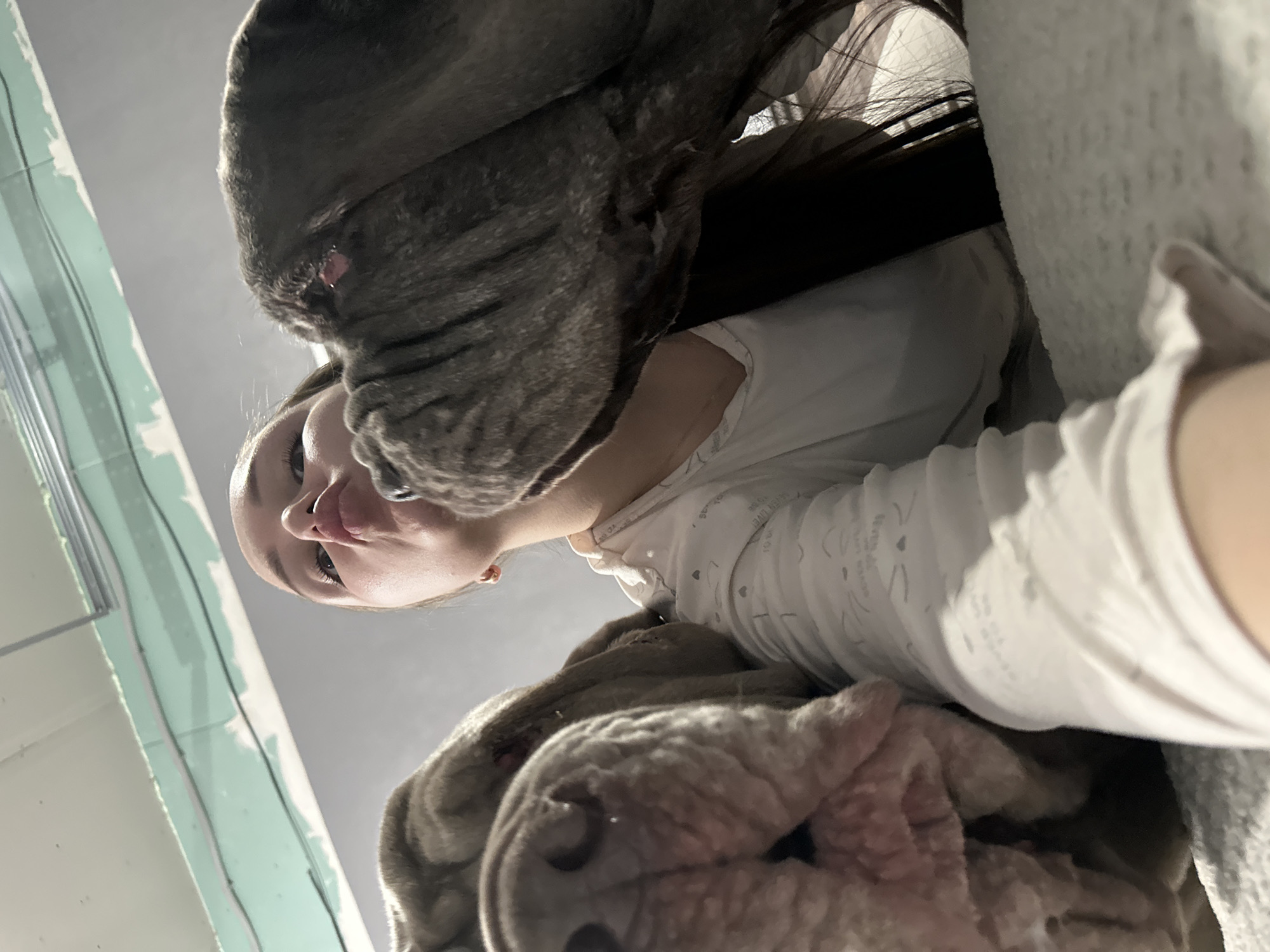 A low-angle shot depicts a woman and two dogs. The woman is fair-skinned with light brown hair. She wears a white long-sleeved shirt. Two large dogs with short gray fur appear close to the camera. The dogs are positioned at different angles, with one directly above the woman's face. The image does not contain sufficient information to identify the location.