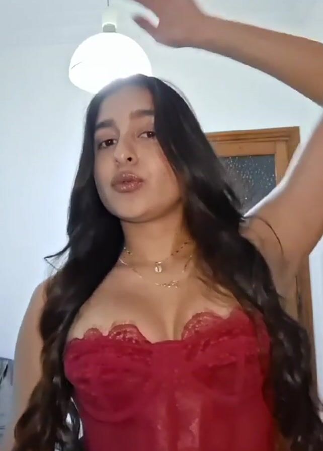 A young woman with long dark hair, wearing a red lace-trimmed corset top and gold necklaces, poses for the camera
