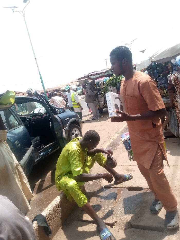 The scene depicts a busy street or market area in Kafanchan B, Nigeria, during daylight hours under direct sunlight. In the immediate foreground, a man wearing a wet lime green traditional top and matching trousers, along with blue and green slides, is seated on a concrete curb. He holds a dark, gourd-like or metallic container in both hands and is looking down at it. Adjacent to him, a dark-colored small SUV or car is stopped with its driver's side front door wide open, revealing a light-colored item on the seat. A green object rests on the car's roof near the open door. The ground around the seated man and the car is wet. Standing to the right of the seated man is another man, dressed in an orange-brown traditional long-sleeved garment and dark grey slides. He holds a white rectangular box, decorated with multiple grey headphone icons, in his left hand, presenting it slightly forward. His right hand is in his pocket, and he is looking towards the left. In the mid-ground, a paved road stretches, populated by several individuals and vehicles. A man in a white shirt and a bright yellow reflective vest stands near the stopped car, facing away. Further back, a person in light clothing is seen near a three-wheeled motorized vehicle, possibly a Keke Napep, which is heavily loaded with fresh produce and covered by a dark tarp. Various market stalls with merchandise and tarpaulin covers line the background, indicating a commercial area. A tall, slender street light pole, painted green and white with a solar panel on top, extends upwards from the left side of the frame. Shadows are clearly visible on the ground.